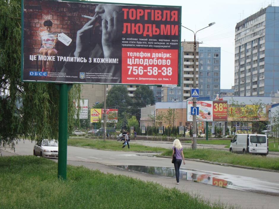 Білборд у Дніпропетровську з інформацією про гарячу лінію з протидії торгівлі людьми, що функціонує за сприяння Координатора проектів ОБСЄ в Україні, 1 червня 2010 р.