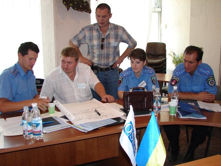 Ukrainian police officers discuss combating trafficking in human beings at a workshop in Odessa organized by the OSCE Project Co-ordinator in Ukraine, 3 August 2007.