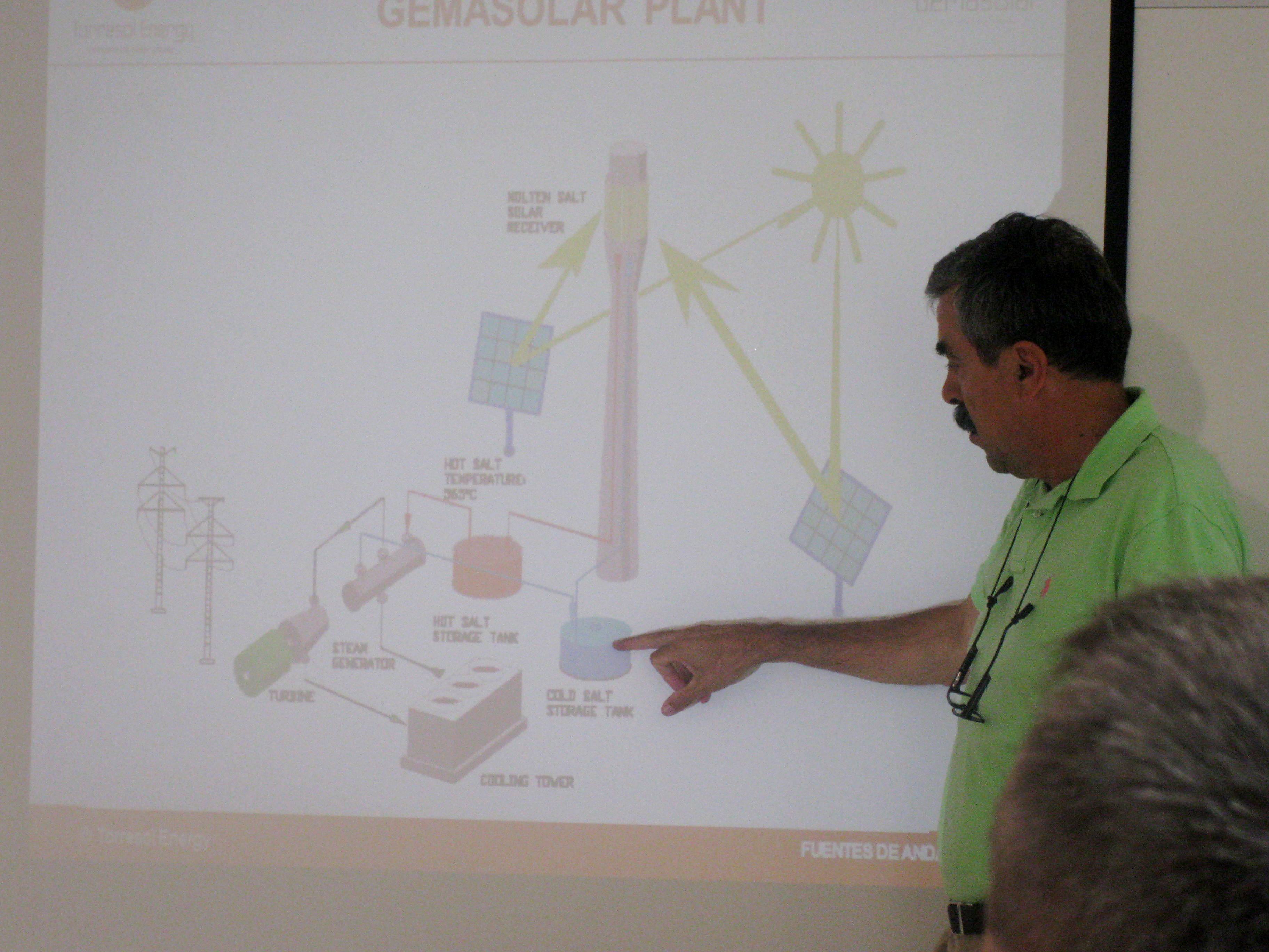 Santiago Arias, the Technical Director, Operations and Maintenance, of Torresol Energy, describes technological solutions in the Gemasolar Concentrated Solar Power plant’s operation. Gemasolar’s projected annual production of 110 GWh is equivalent to the power generated in burning 89,000 metric tons of lignite coal, or 217,000 barrels of oil. By using solar energy for electricity production, the plant reduces annual emission of CO2 by 30,000 tons. Fuentes de Andalucía, 28 September 2011.