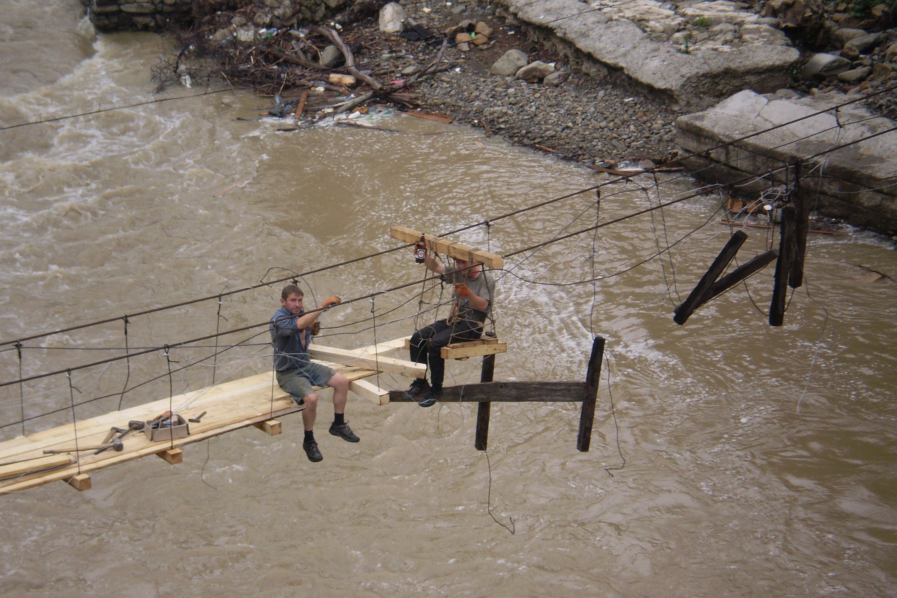 Workers restore a bridge after a catastrophic flood in the Carpathian Mountains, western Ukraine, 21 July 2009.