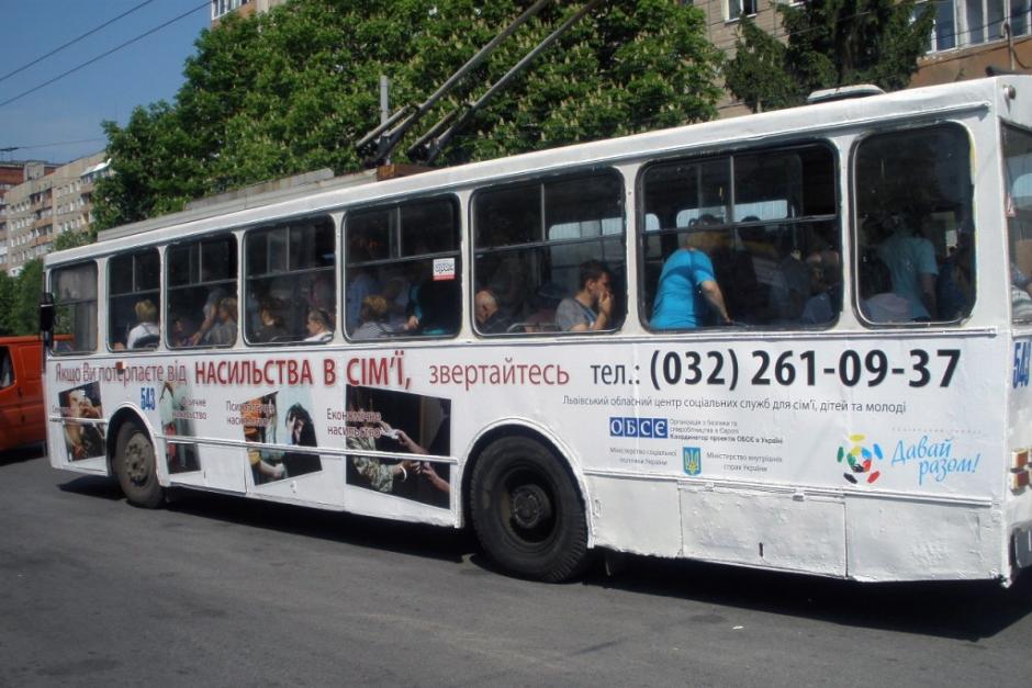 A trolleybus displaying an anti-domestic violence awareness poster, produced as part of an awareness-raising campaign supported by the OSCE Project Co-ordinator in Ukraine, Lviv, 5 May 2012.