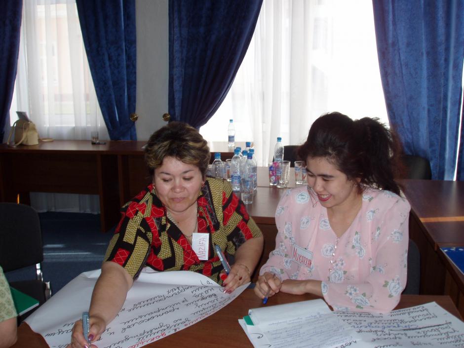 Two Uzbek women improve their advocacy skills during a training session organized by the OSCE Centre in Tashkent. The session was part of a wide-ranging programme aiming to increase women's involvement in public and political life, 13 May 2004.