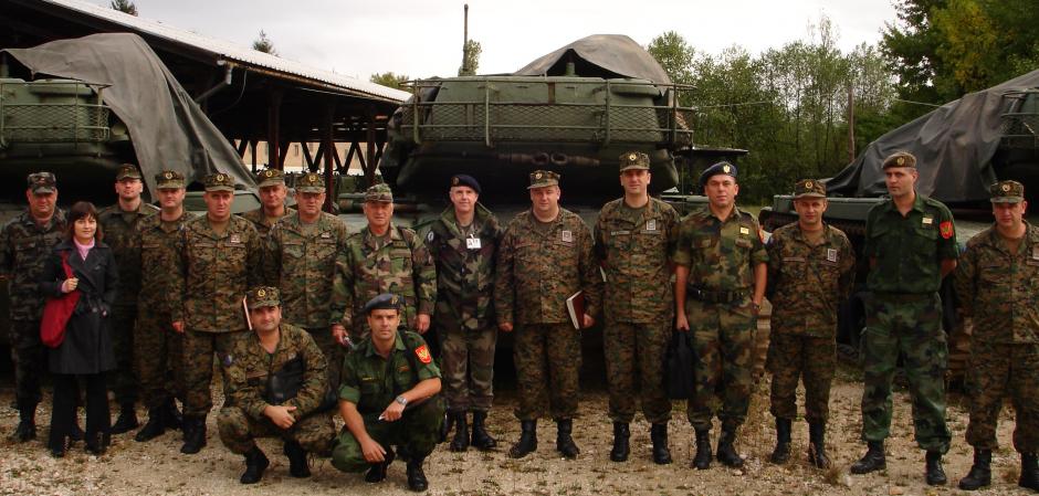 Soldiers from Montenegro pose in front of tanks during an inspection under the Dayton Article IV Agreement on Sub-Regional Arms Control, Butile, Bosnia and Herzegovina, 10 October 2007.