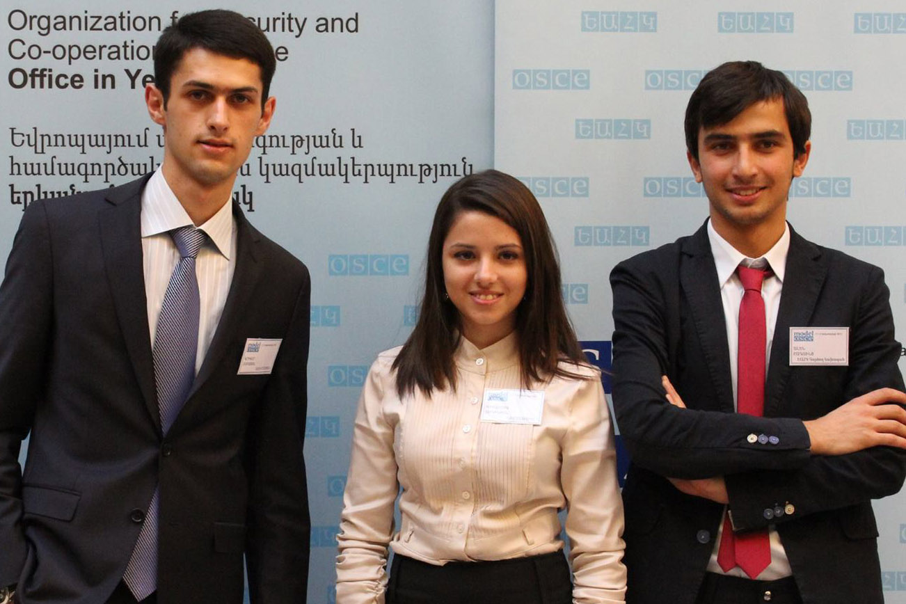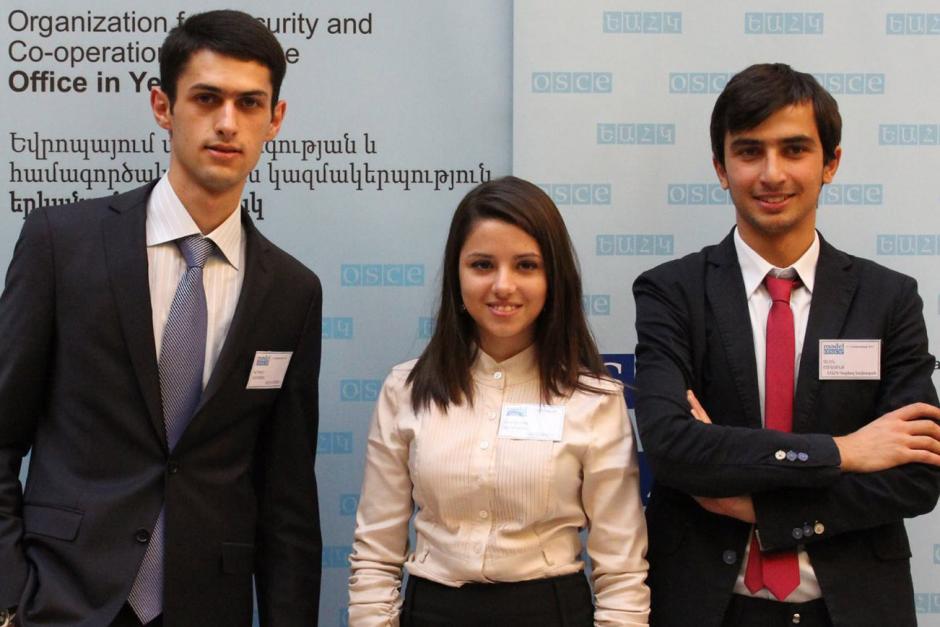 Three best participants in Model OSCE in Armenia (r-l): Alen Shadunts, 20, international relations student at the American University of Armenia, Victoria Aydinyan, 19, political science student at Yerevan State University and Grigor Chobanyan, 21, law student at Yerevan State University.