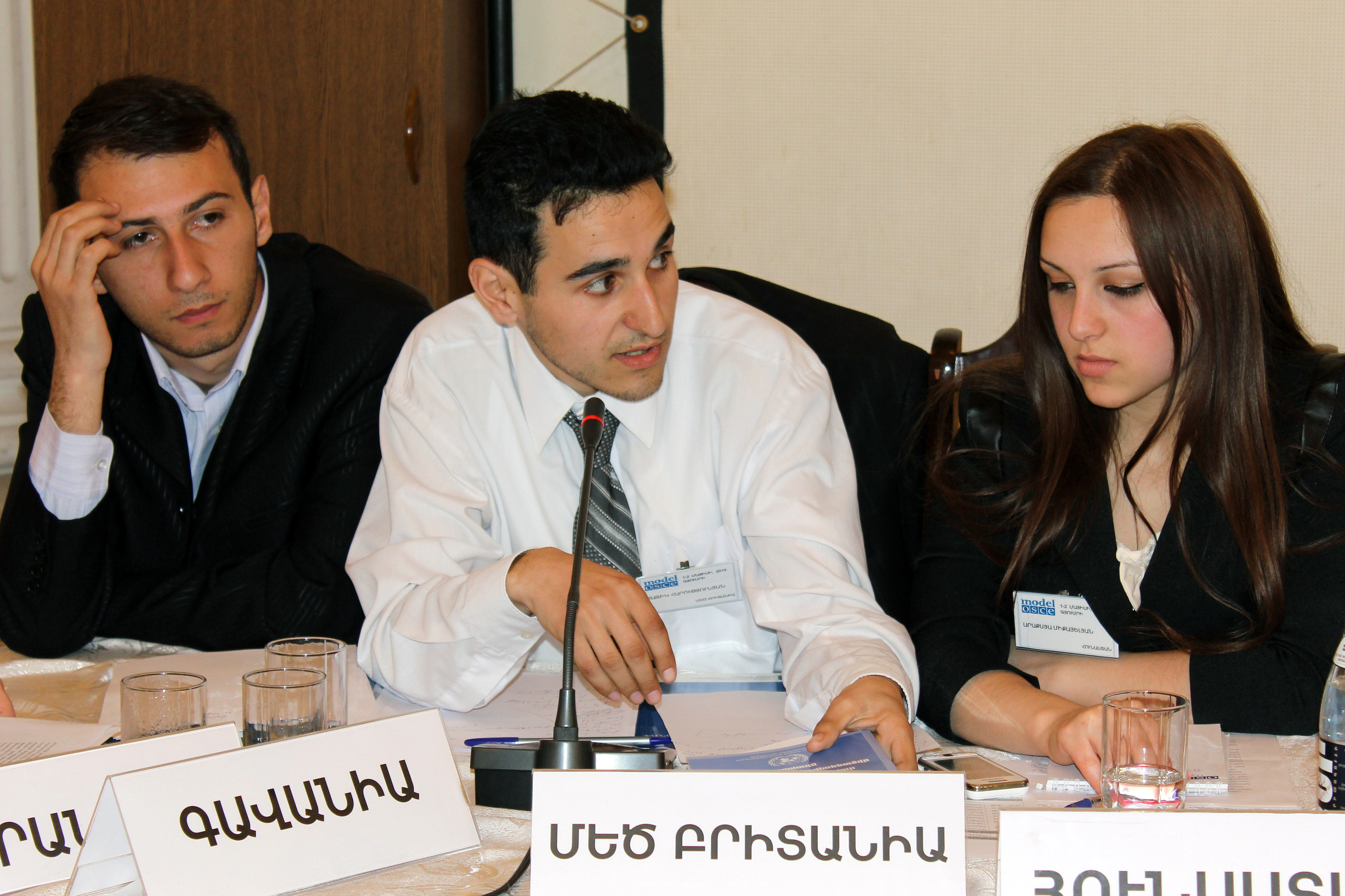 Qajik Harutyunyan, a student from the Gyumri Pedagogical University, playing a UK Ambassador during a Model OSCE Conference, Gyumri, 1 May 2015.