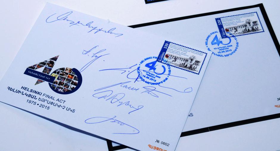 The Special Envelope with an OSCE postage stamp and special postmark was prepared for the occasion by the Haypost National Operator of Armenia and officially launched at the event. Also launched at the event were a photo exhibition and an anniversary publication with messages from high officials, brief information on the Helsinki Final Act and activities of the OSCE and the Office in Yerevan.