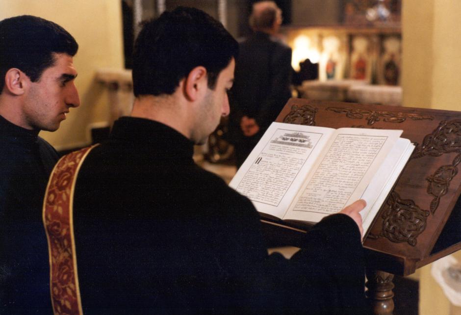 A religious service at Armenia's Echmiadzin monastery, February 2001.