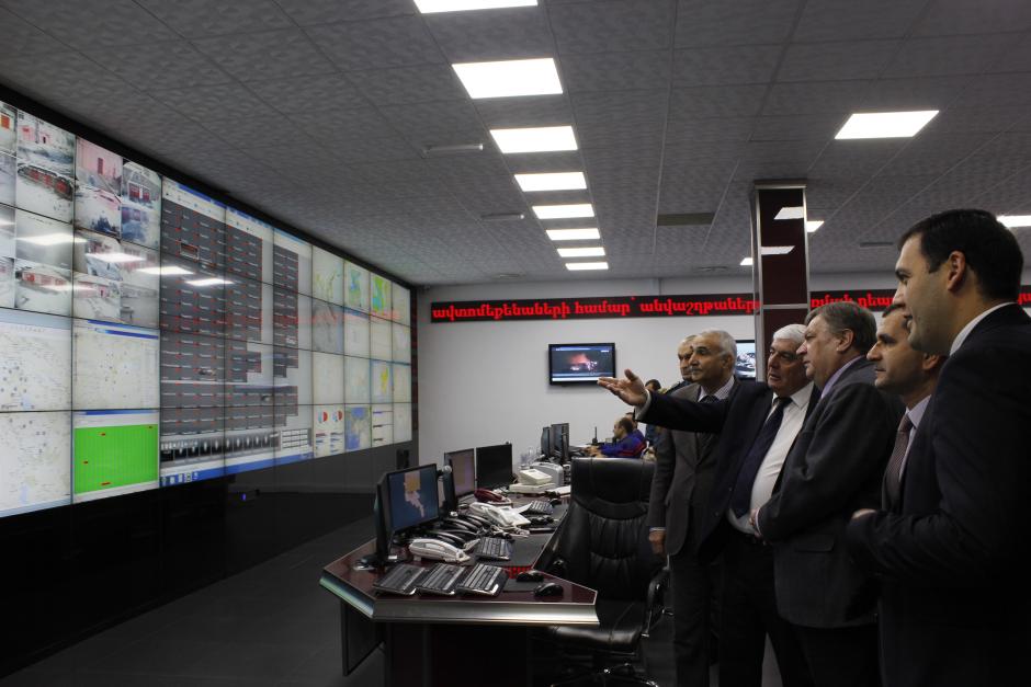 The Head of the OSCE Office in Yerevan Ambassador Sorokin alongside the Head of Staff at the Ministry of Territorial Administration and Emergency Situations Hamlet Hakobyan presenting capacities and functions of the Crisis Management Centre, Yerevan, 14 December 2015.