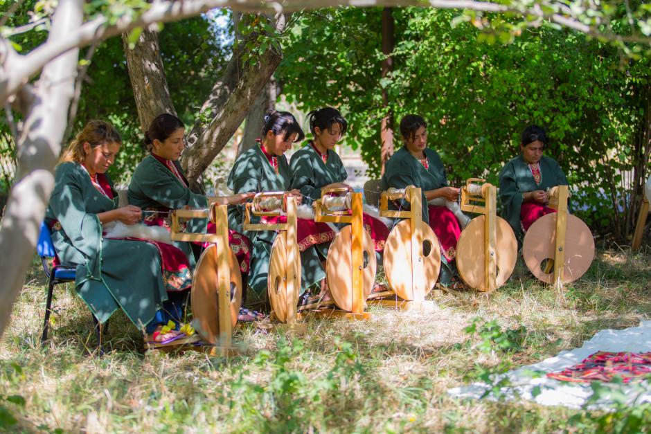 Members of the "Wool to Carpet" handicraft studio spinning wool, Shinuhayr, 12 August 2015.