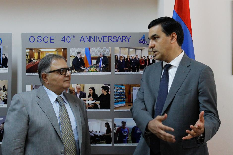 Head of the OSCE Office in Yerevan Ambassador Argo Avakov (l) and and Armenia’s Human Rights Defender Arman Tatoyan (r) discuss co-operation in the area of human rights protection, Yerevan, Armenia, 31 August 2016.