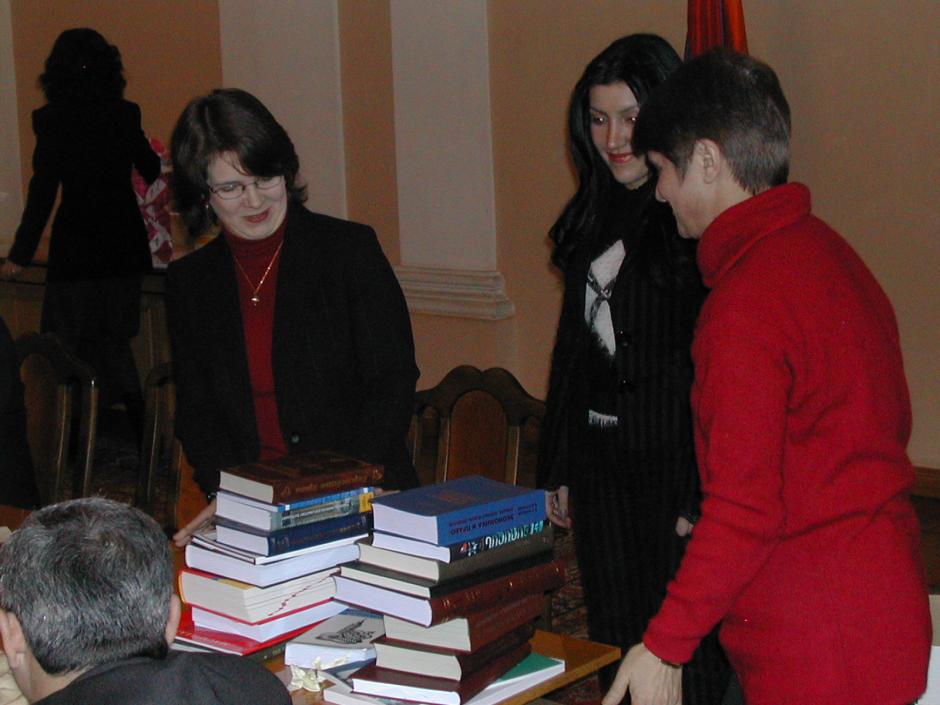Deputy Head of Office Elaine Conkievich (left) hands over books to the librarian of the National Assembly, Yerevan, 28 December 2004.
