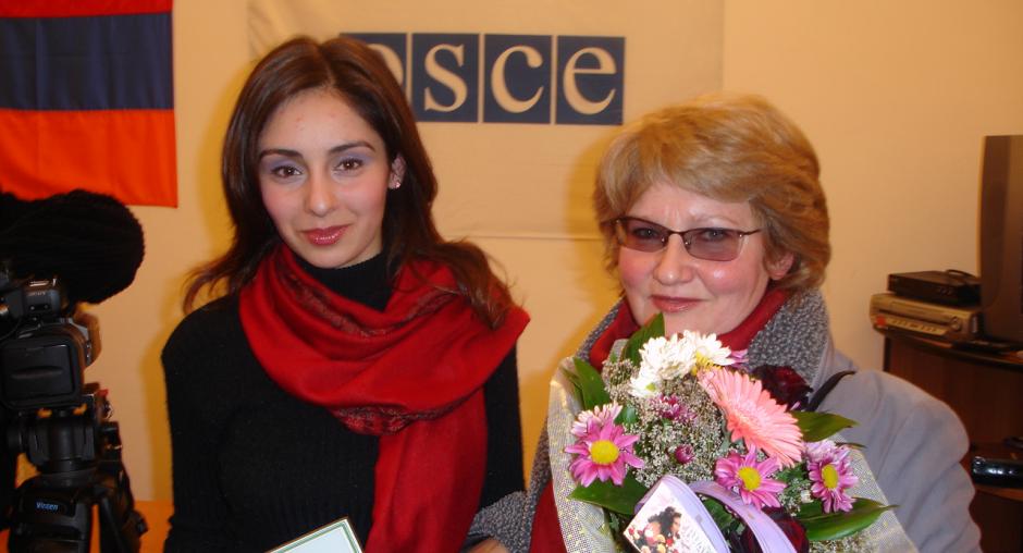 Inga Zarafyan of VEM studio (right) and Mary Chakryan of Kentron TV, in Yerevan, 12 December 2005. They got the first and second prizes of the annual competition for environmental journalism, organized by the OSCE Office in Yerevan and the Aarhus Centre. (OSCE)