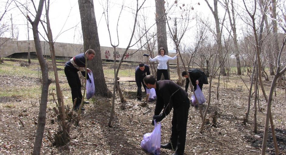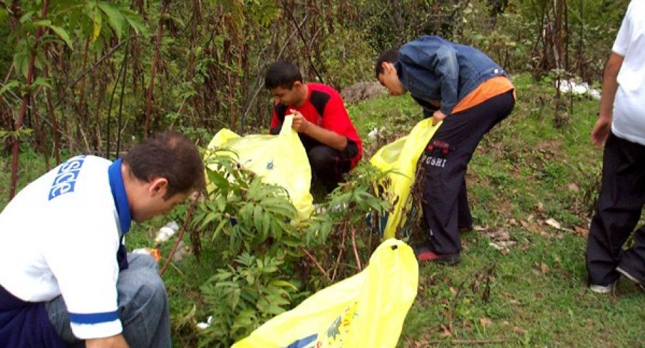 Schoolchildren and local volunteers help clean up the land around King Vahan's Monastery in Syunik, part of an environmental awareness campaign organized by the OSCE and the Aarhus Centre in Kapan, 13 October 2006. (OSCE)