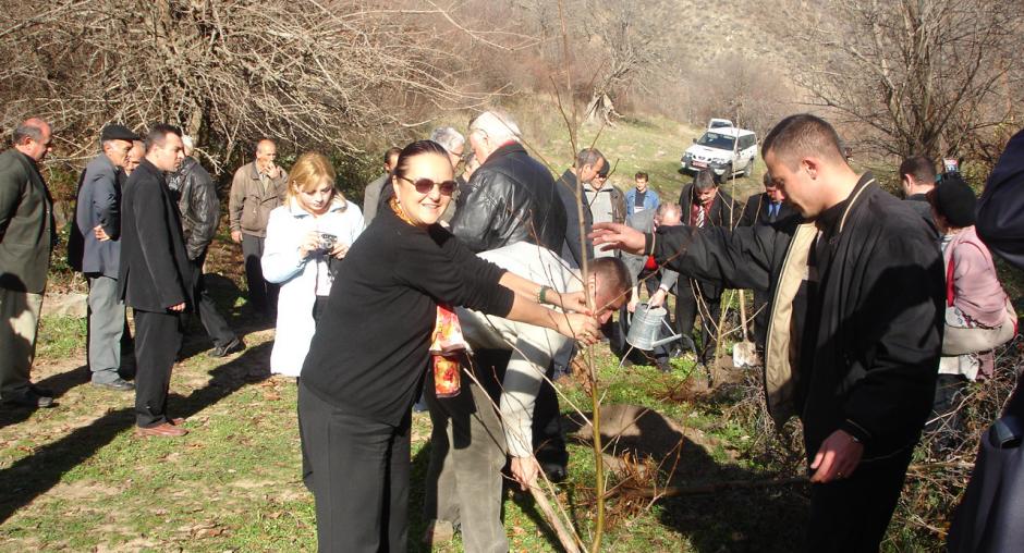 Jeannette Kloetzer, Economic and Environmental Officer at the OSCE Office in Yerevan (left), helped to plant trees in the Syunik province after the opening of Armenia's first regional Aarhus Centre, 9 December 2005. (OSCE)