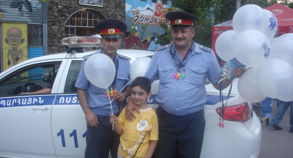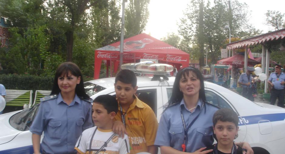 Children have their photos taken with police, sit in police cars and play with police equipment at a Police Open Day in Yerevan on 16 August 2008. (OSCE)