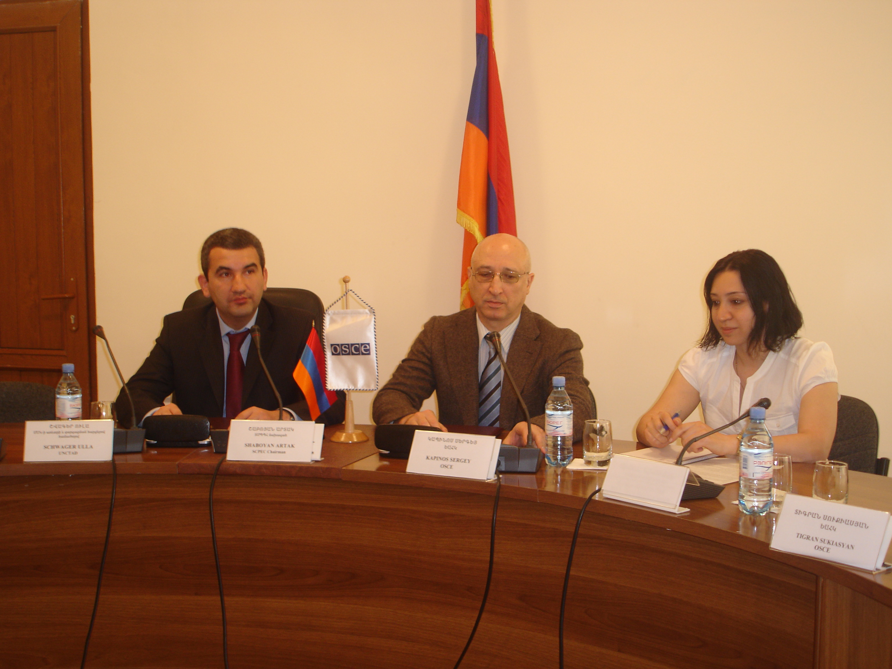 Ambassador Sergey Kapinos, Head of the OSCE Office in Yerevan (c) and Artak Shaboyan, Chairman of Armenia's State Commission on Economic Competition, at the signing of an agreement on co-operation to foster economic competition, Yerevan, 2 June 2010.