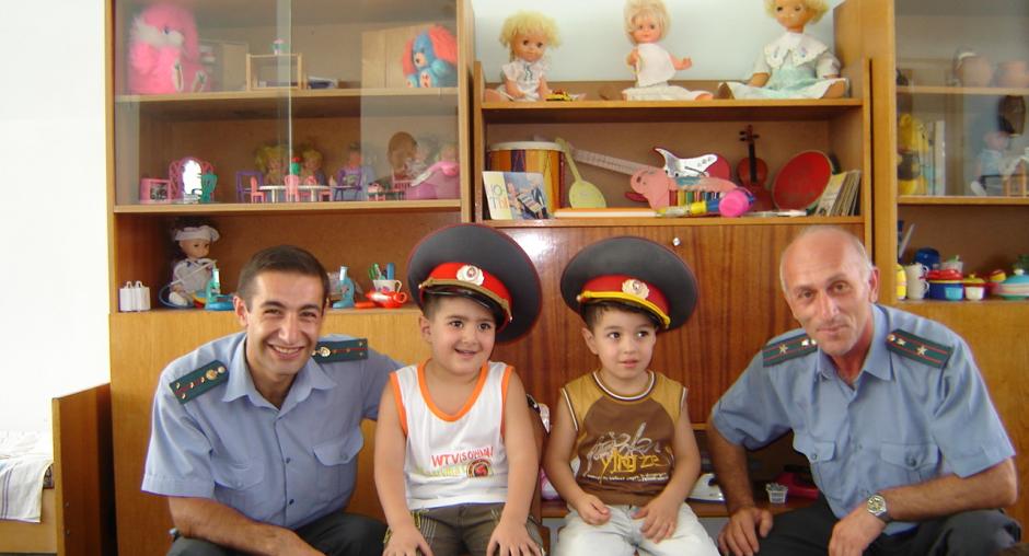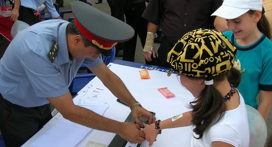 Community policing officers fingerprinting children during a police open day in Yerevan supported by the OSCE Office, 16 August 2008. (OSCE/Laura Hayruni)