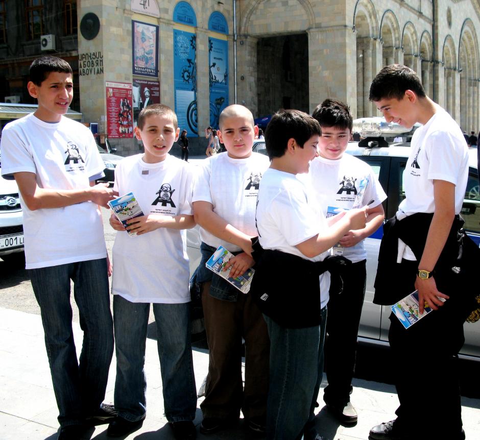 During Road Safety Week in Armenia schoolchildren advised pedestrians on how to cross streets according to the traffic rules, distributed flyers and promotional gifts. The week was organized by the OSCE Office in Yerevan, UNDPI Armenia and the National Road Safety Council. Yerevan, 11 May 2011.