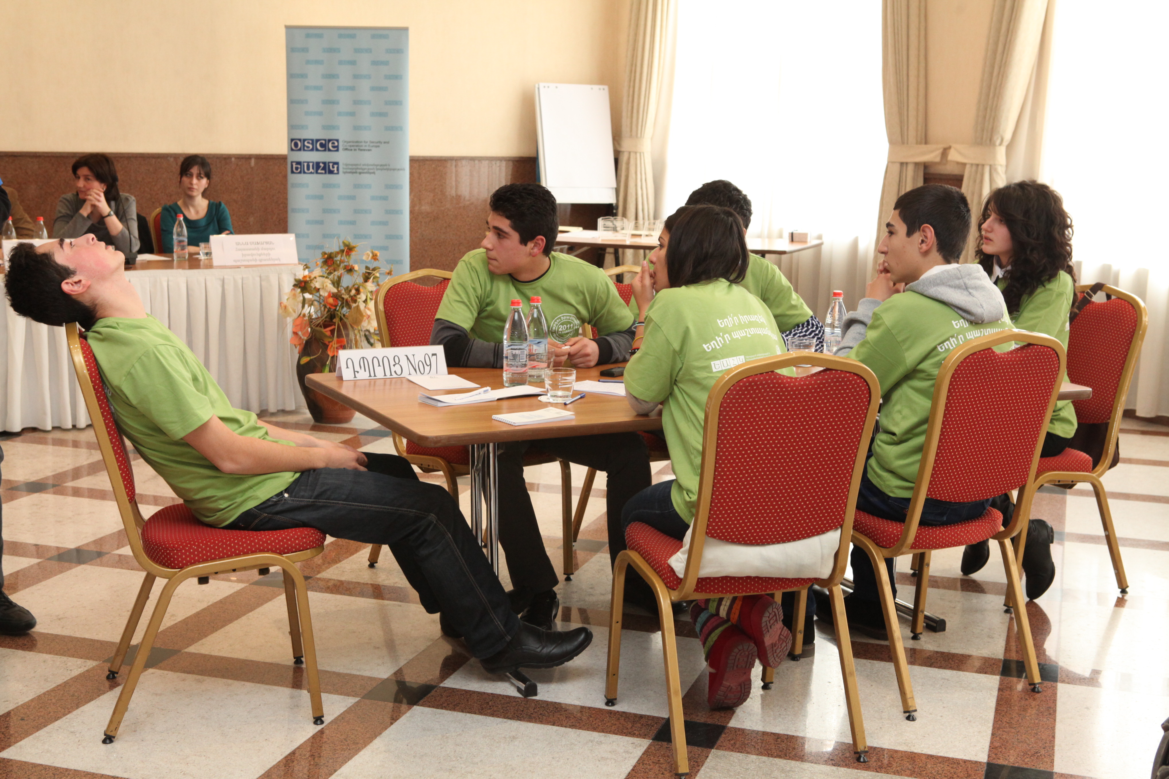 High school students discuss the answer to the question on human rights during an interactive game organized by the OSCE Office in Yerevan and the Yerevan Club of Intellectual Games.