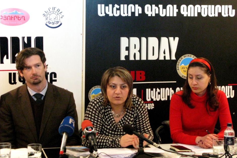 L-r: Oliver McCoy, Democratization Programme Manager of the OSCE Office in Yerevan, Liana Sayadyan, Vice-President of Investigative Journalists NGO and Lusine Hakobyan, President of Europe in Law Association, at the presentation of a publication on violence against journalists in Armenia, Yerevan, 20 February 2012.
