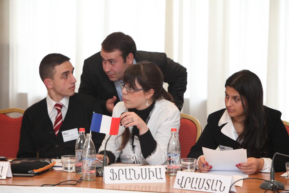 Students playing representatives of France, Poland (EU Chair) and Finland discuss a possible decision at a Model OSCE Conference on cyber security organized by the OSCE Office in Yerevan on 18-19 November 2011.