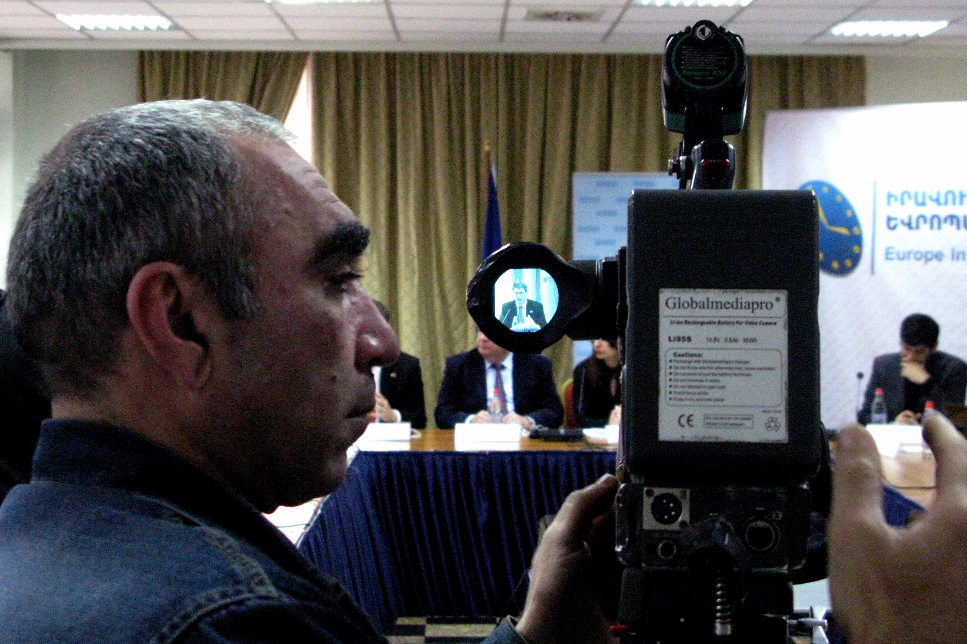 A cameraman records the launch of a workshop co-organized by the OSCE for media representatives on responsible, accurate and balanced reporting on elections, Yerevan, 2 April 2012.
