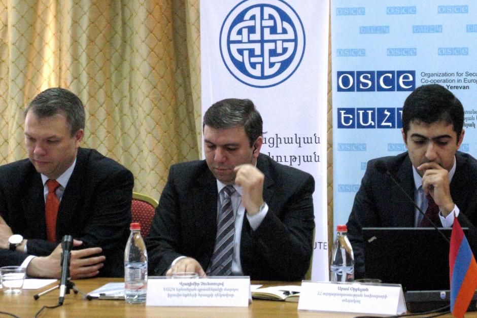 (L-r) Human Rights Officer of the OSCE Yerevan Office Vladimir Tchountoulov, President of the Civil Society Institute Arman Danielyan, and Deputy Minister of Justice of Armenia Aram Orbelyan at the OSCE-supported workshop on probation standards, Yerevan, 30 April 2012.