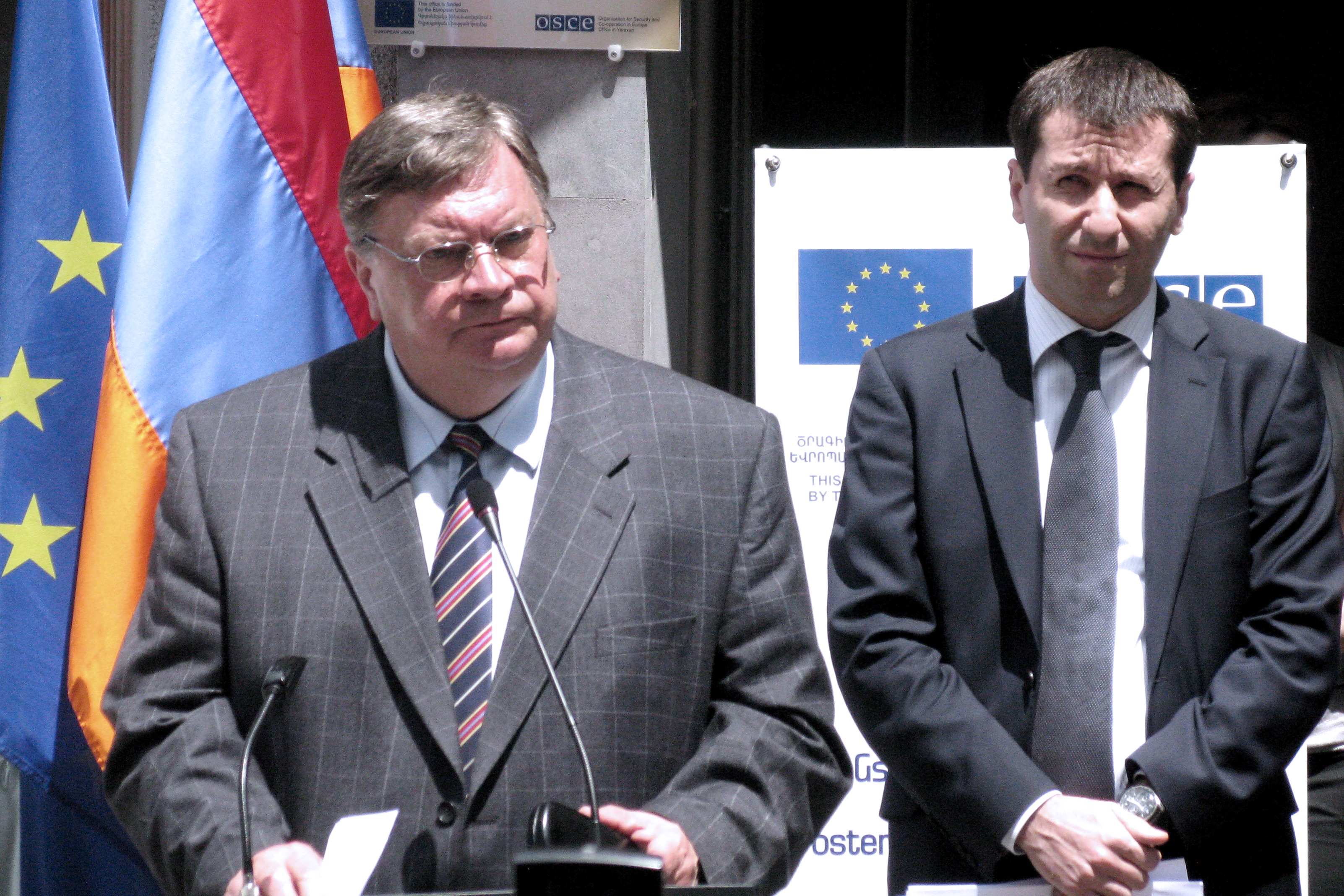 Ambassador Andrey Sorokin (l), Head of the OSCE Office in Yerevan and Human Rights Defender Karen Andreasyan (r), make welcome speeches at the Armenian Human Rights Defender’s regional office, Vanadzor, 6 June 2012.
