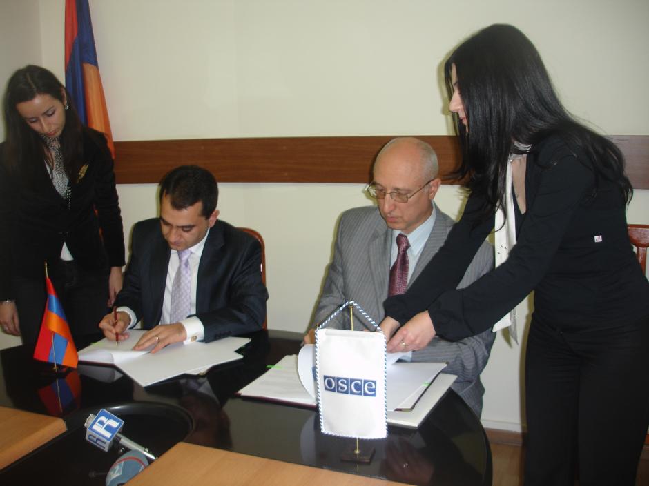 The Head of the OSCE Office in Yerevan, Ambassador Sergey Kapinos (r), and Armenia's Minister of Labour and Social Issues, Arsen Hambardzumyan, sign a memorandum to establish an anti-trafficking support unit, Yerevan, 4 November 2008.