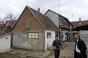 Milutin Okresa (left), and Momir Vukmirovic of the OSCE Office in Zagreb's Housing Care Unit, in front of the house provided for the six-member Okresa family, Vukovar, 2 March 2009.