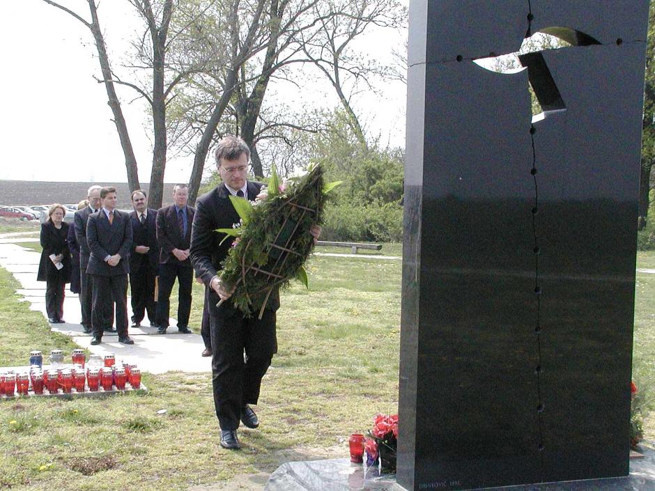 lays a wreath at the Ovcara Memorial Site near Vukovar, April