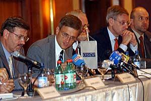 Croatian Deputy Foreign Minister Mario Nobilo (left), Head of Mission Peter Semneby and former Swedish Prime Minister Carl Bildt (4th left) at the International Conference on Minority Integration in Southeast Europe and the Baltic States, Zagreb, 2 July.