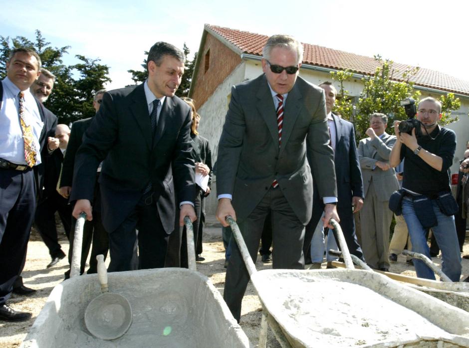 OSCE Chairman Solomon Passy (left) and Croatian Prime Minister Ivo Sanader contribute to the reconstruction of Serb returnee houses in the Zadar area, 11 May 2004.