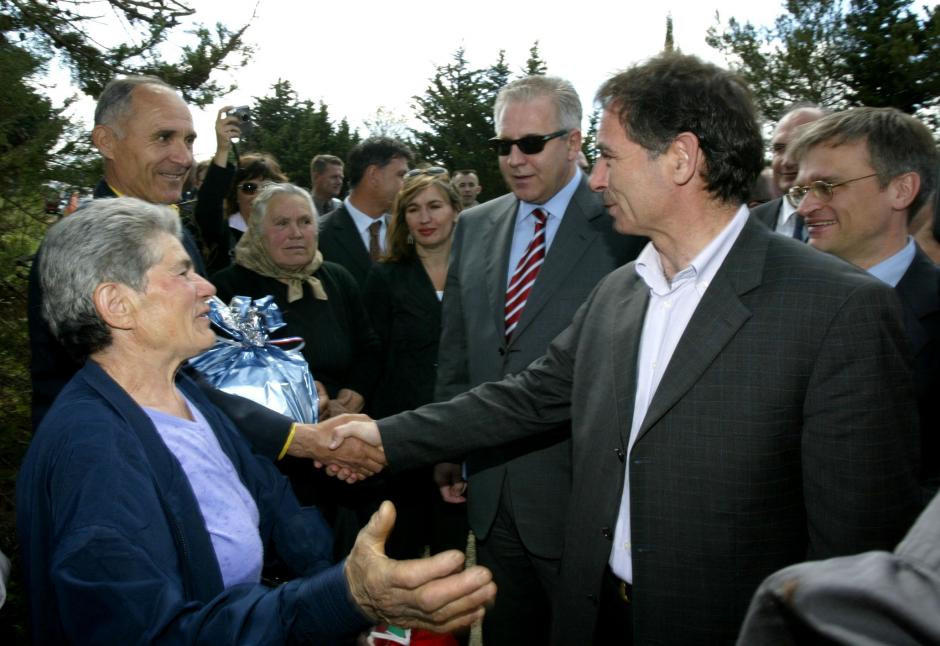 Milorad Pupovac, a Serb minority MP in the Croatian Parliament (right), meets Serb returnees near Croatia's southern coastal town of Zadar, Biljane Donje, 11 May 2004.