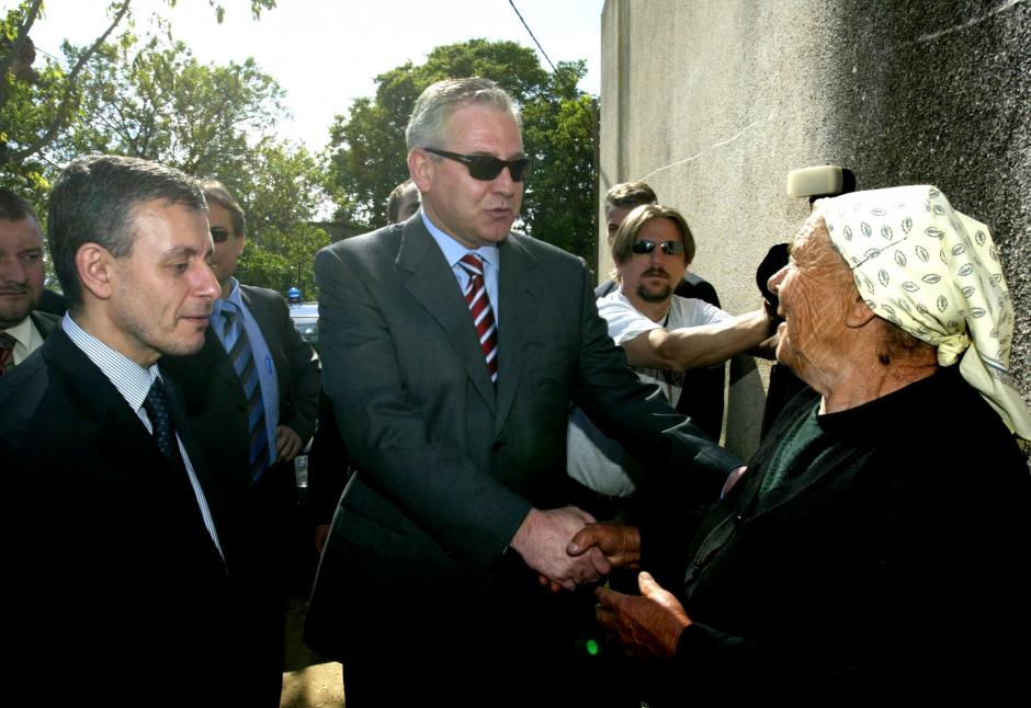 OSCE Chairman-in-Office Solomon Passy (left) and Croatian Prime Minister Ivo Sanader meet Serb returnees, Zadar hinterland, 11 May 2004.