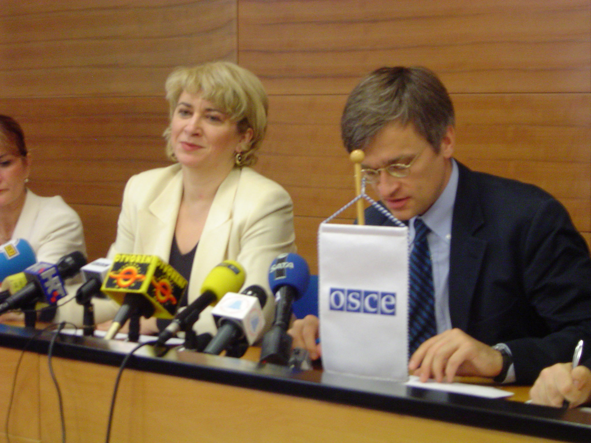 Croatian Justice Minister Vesna Skare Ozbolt (left) and Head of the OSCE Mission to Croatia, Amb. Peter Semneby, present two Mission reports calling for reform of domestic war crimes procedures in Croatia, Zagreb, 22 June 2004.