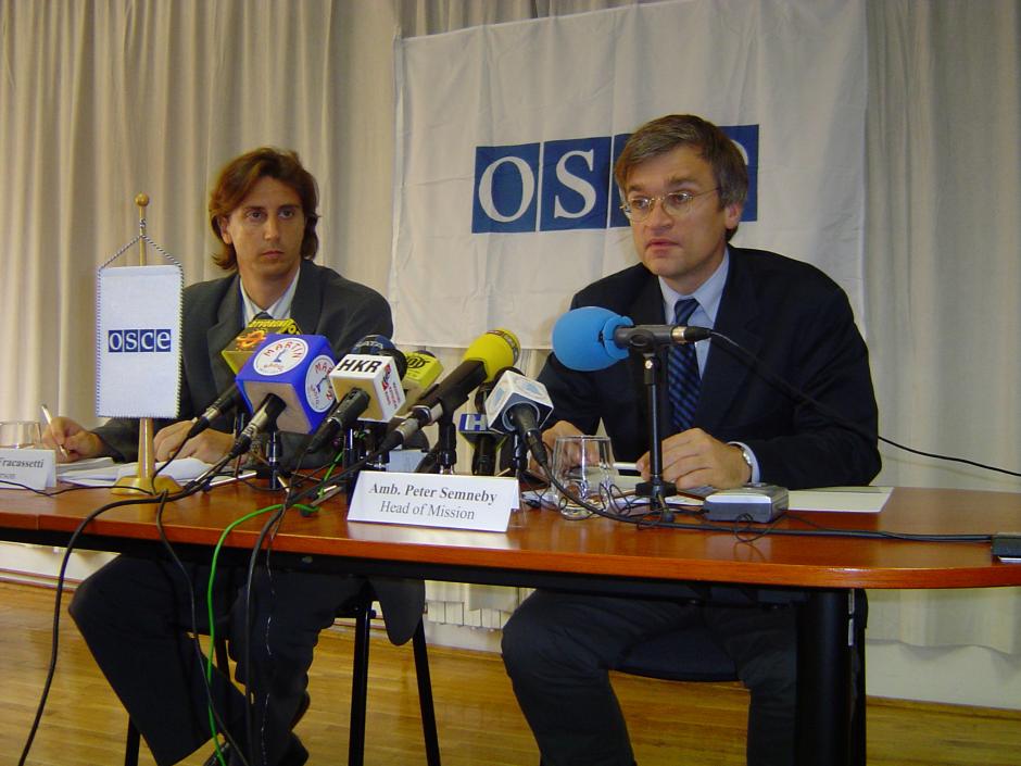 Ambassador Peter Semneby (right) presented the Mission's regular report in Zagreb on 6 July 2004. The report represented the first since Croatia gained EU candidate status. To the left is Spokesperson Alessandro Fracassetti.