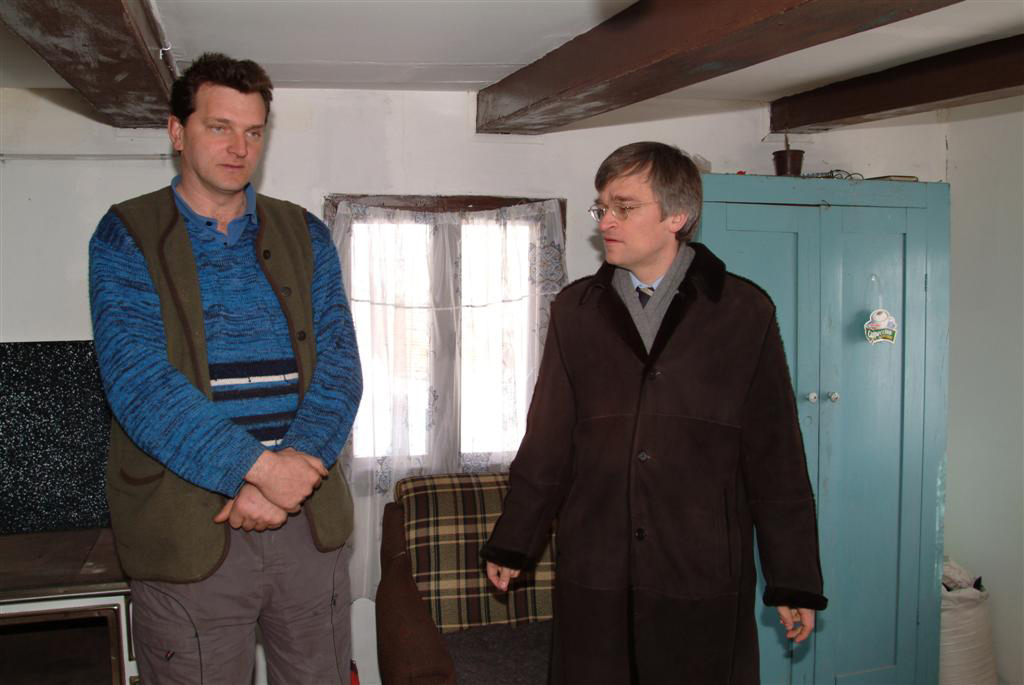 Nedjeljko Vukdragovic (left) tells OSCE Mission Head Peter Semneby of the daily struggles living as a returnee, 10 February 2005. His family benefited from an OSCE-funded winter aid project aimed at sustainable return.