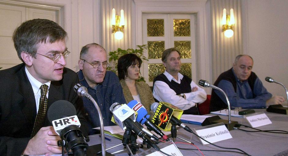 (FaH)Ambassador Peter Semneby (left), Head of the OSCE Mission to Croatia, presents an OSCE-funded project on monitoring of media election coverage, 5 November 2003. (FaH) Photo details