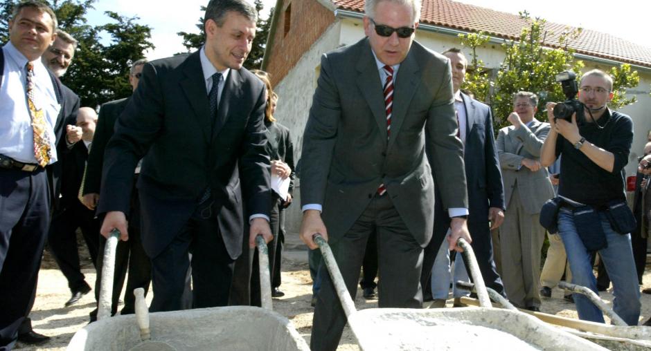 (OSCE)OSCE Chairman Solomon Passy (left) and Croatian Prime Minister Ivo Sanader contribute to the reconstruction of Serb returnee houses in the Zadar area, 11 May 2004. (OSCE) Photo details