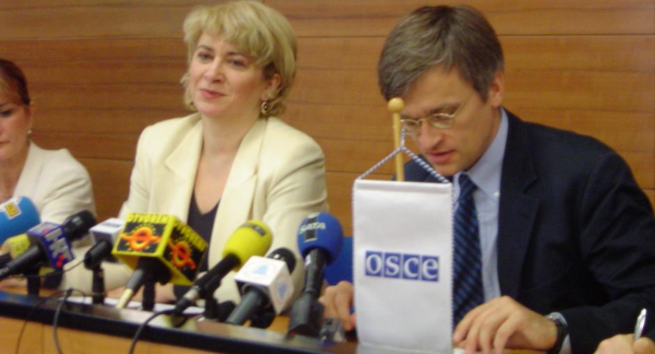(OSCE)Croatian Justice Minister Vesna Skare Ozbolt (left) and Head of the OSCE Mission to Croatia, Amb. Peter Semneby, present two Mission reports calling for reform of domestic war crimes procedures in Croatia, Zagreb, 22 June 2004. (OSCE) Photo details