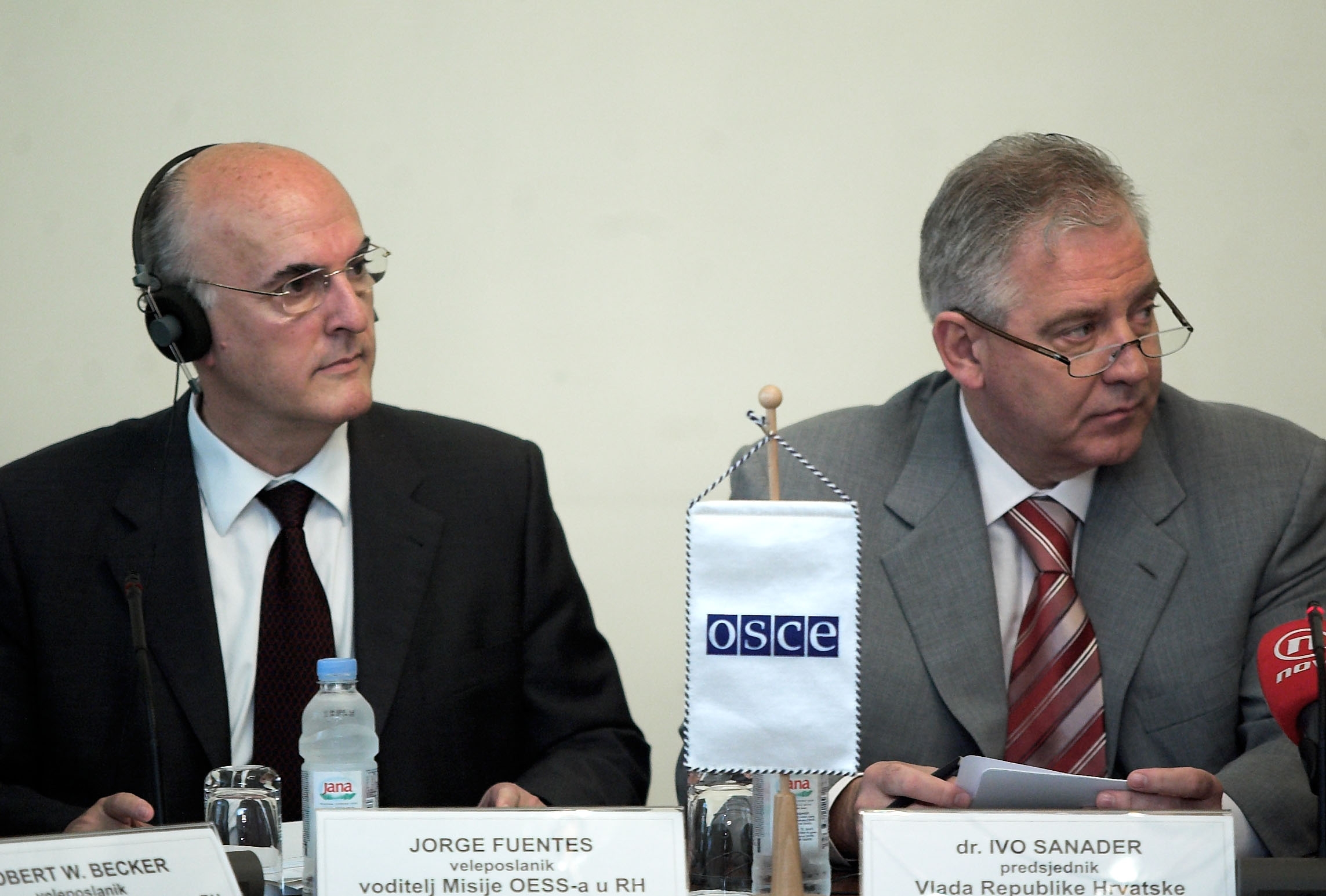 The Head of the OSCE Mission to Croatia, Ambassador Jorge Fuentes (left) and Croatian Prime Minister, Ivo Sanader at a roundtable discussion on minority employment held at the Parliament in Zagreb, 21 May 2007.